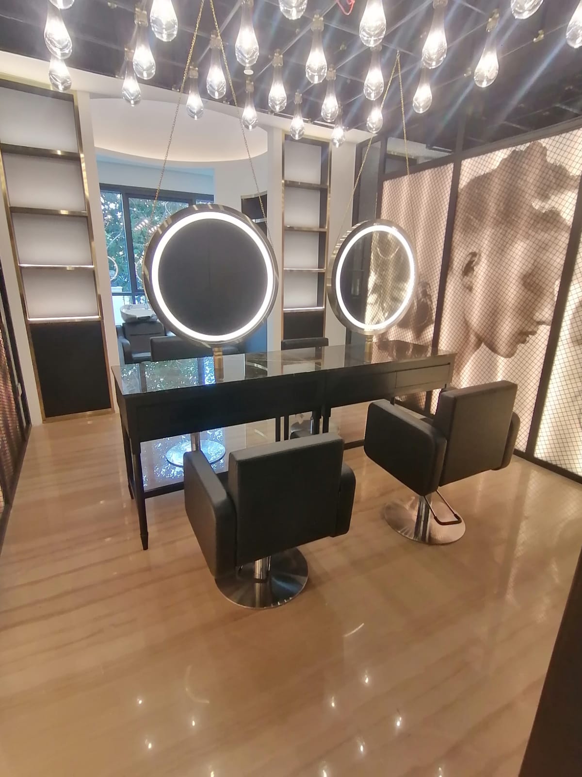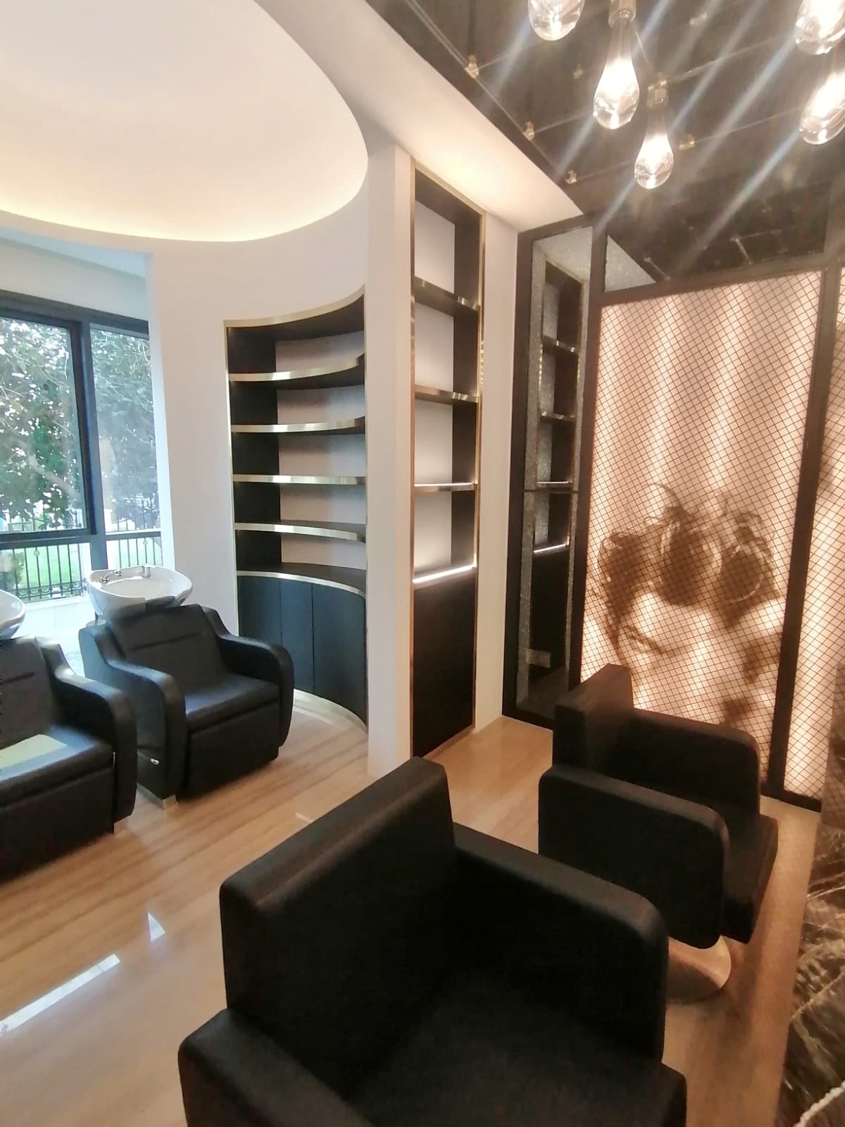 The salon’s design direction was inspired by bold contrast and tactile luxury. Deep blacks, metallic brass accents, and polished stone textures form the core of the aesthetic. Statement lighting fixtures were suspended throughout to create ambiance and theatrical glamour perfect for a premium self-care space. The kids’ area (not pictured here) was designed with soft tones, flexible furniture, and safety-conscious finishes to allow freedom of movement and fun.
