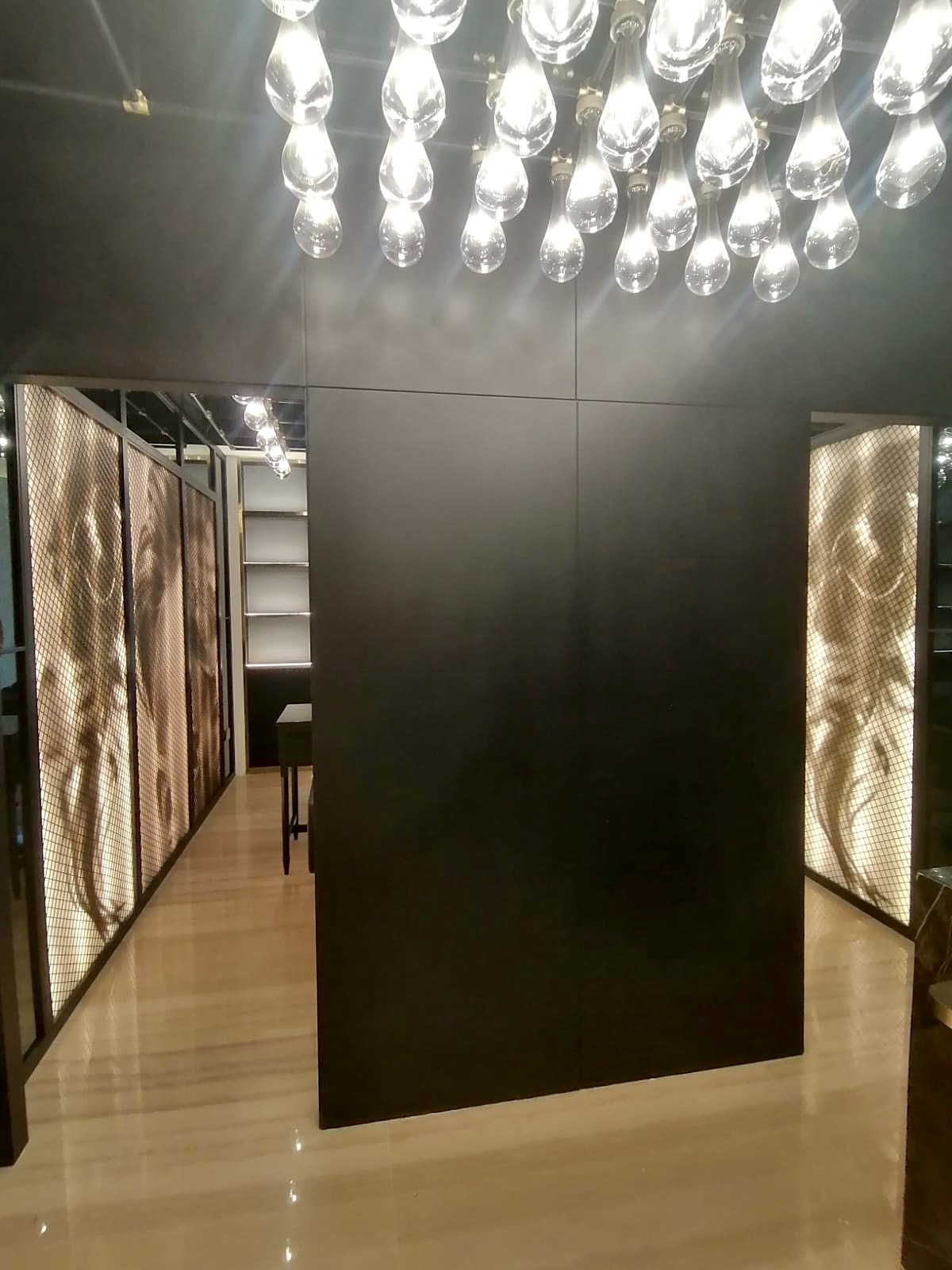 This salon now serves as a chic, high-end retreat where lighting, texture, and layout all contribute to a premium customer journey. The layered black finishes, mirror compositions, and golden trims speak of refined luxury, while the children’s section adds value for families visiting the hotel. A perfect example of multi-functional commercial space designed with elegance and efficiency.